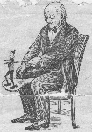 More fascinating than the hand puppets was Grandpa’s jig-doll, a dancing clown. The clown was made from colored pieces of wood that were fastened together loosely with a string. Attached to the back of the figure was a stick. Grandpa held the clown by this stick. Between his legs, he had a flexible paddle. He held the clown so that its feet just rested on the wooden paddle. Then Grandpa drummed on the paddle with his other hand and the clown began to dance, set into motion by the vibrations from the paddle. I have no idea whatever became of this dancing clown. After moving from the house on Victoria, I never saw it again.