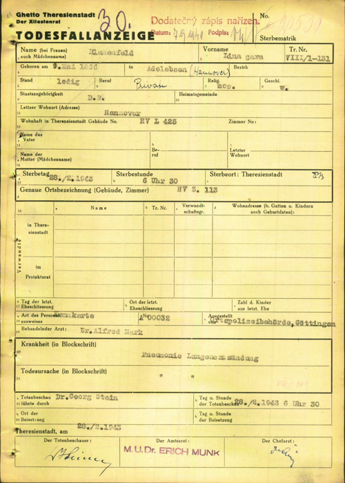 Lina Blumenfeld was deported to Theresienstadt with her sister Johanna on 23 July 1942 and was murdered there on 28 February 1943.9 The Stoplerstein commemorating her in Wissmann-strasse in Hanover has an incorrect birth year. Her death certificate issued by the authorities in Göttingen below from holocaust.cz lists her cause of death as pneumonia!10
