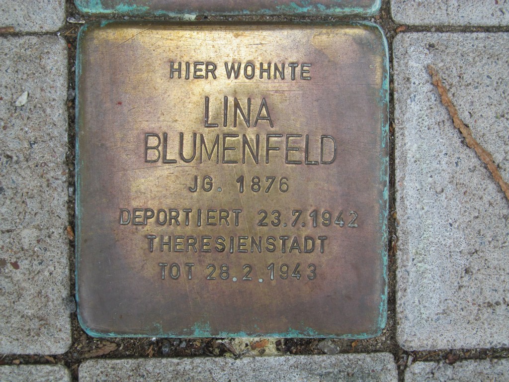 “When the owner of the house on Wöhlerstrasse […] wanted to sell her property in 1939, Lina and her sister decided to move to Hanover,”5 where they lived at 13 Wissmannstrasse in one of two houses owned by the Simon’sche Stiftung (a Jewish foundation). “These houses were the last voluntary places of residence of more than 60 victims of the Nazi era.”6 Stoplersteine for Lina and Johanna Blumenfeld were placed in front of 13 Wissmannstrasse in 2010.