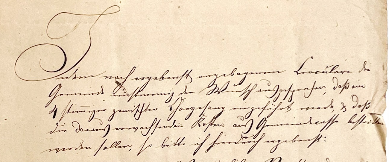 The German text of the above reads: Indem nach ergebenst angebogenem Circulare die Gemeinde einstimmig den Wunsch ausgesprochen, dass ein 4-stimmiger gemischter Chorgesang eingeführt werde, und dass die daraus erwachsenden Kosten aus Gemeindecasse bestritten werden sollten, so bitte ich hierdurch ergebenst: