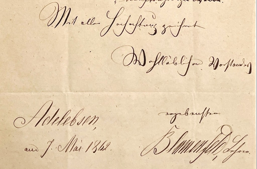 Among the Adelebsen Jewish Community records to be found in the YIVO Institute for Jewish Research Repository in New York is a collection of 18 letters and one postcard written by Sally Blumenfeld.1 They are written in Kurrentschrift (cursive script), an old form of German-language handwriting that was used well into the 20th century, combined with “Latin cursive.” Kurrent is a challenge for the modern reader, and there are not many people who are able to read it today. An additional challenge is that German vocabulary and spelling have undergone considerable changes since the middle of the 19th century when the teacher Sally Blumenfeld himself went to school. The text below is the first paragraph of the first letter in the collection, and provides a good example of this style of writing.