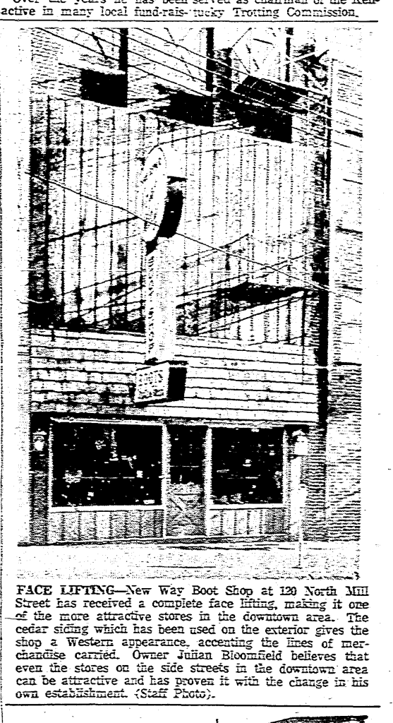 To augment their main shoe store on the corner of Mill and Short Streets in downtown Lexington, Julian and Gishie opened a branch store for shoe repair in the Chevy Chase shopping center in August 1953.21 Later they opened branches in the Southland (March 1962)22 and Eastland (December 1962)23 shopping centers. However, only the store downtown sold merchandise.24 For a time, Bloomfields also operated a liquor store in the Drake Hotel diagonally across the street from their downtown store.25