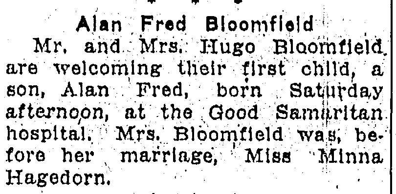 Alan Fredric Bloomfield, born June 2, 1934,1 in Lexington, Kentucky, was the son of Hugo Bloomfield and Mina Cecile Hagedorn and grandson of Abraham Blumenfeld and Sophie Mansbach.