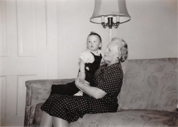 Kitty Clare Holmes Banning (1877–1962), die allen ihren Enkel- und Urenkelkindern als „Gram” bekannt war, war mir aus der Vergangenheit meiner Familie nicht unbekannt. Auf dem Bild hält sie mich auf ihrem Schoss im Haus meiner Grosseltern mütterlicherseits, Clarence Banning und Genevieve Pelleymounter Banning, in der Selby Avenue in St. Paul, Minnesota, um 1952. Unter anderem erinnere ich mich sehr gut an die Haut dieser für mich uralten Frau. Ich liebte es, mit meiner Hand über die feinen Falten auf ihrem Arm zu streichen. Und jedes Mal, wenn ich das tat, sagte meine Mutter, das sei unhöflich und ich solle damit aufhören.