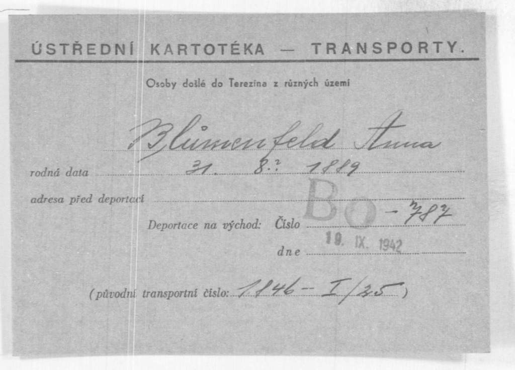 “This transport departed from Anhalter Bahnhof in Berlin on 17 July 1942 and arrived in Theresienstadt in the early evening of the same day. The transport consisted of 100 Jews, of whom 75 were women and 25 were men. The average age of the deportees was 68.6. The youngest was a 41-year-old woman, and the oldest was 84 years old. Eight among them were between 46 and 60 and ninety-one between the ages of 61 and 85.