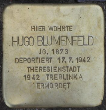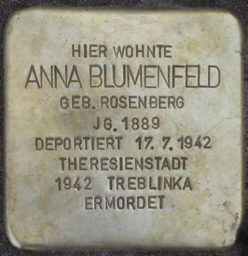 Stolpersteine for Anna and Hugo Blumenfeld were laid on 30 November 2021, in front of their last permanent residence in Berlin at 15 Duisburger Strasse.9