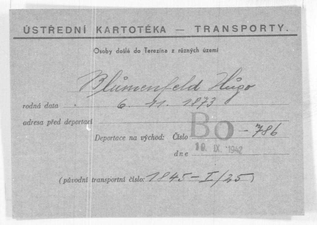 Hugo Blumenfeld was taken from the Theresienstadt Ghetto to the extermination camp at Treblinka, Poland, with about 2,000 others6 with the transport BO on 19 September 1942.7 Treblinka is not given at the transport’s destination. The words on the card “Deportace na východ“ mean “deportation to the east”. Hugo was murdered in Treblinka either before his arrival in the death camp or after his arrival on 21 September 1942.8